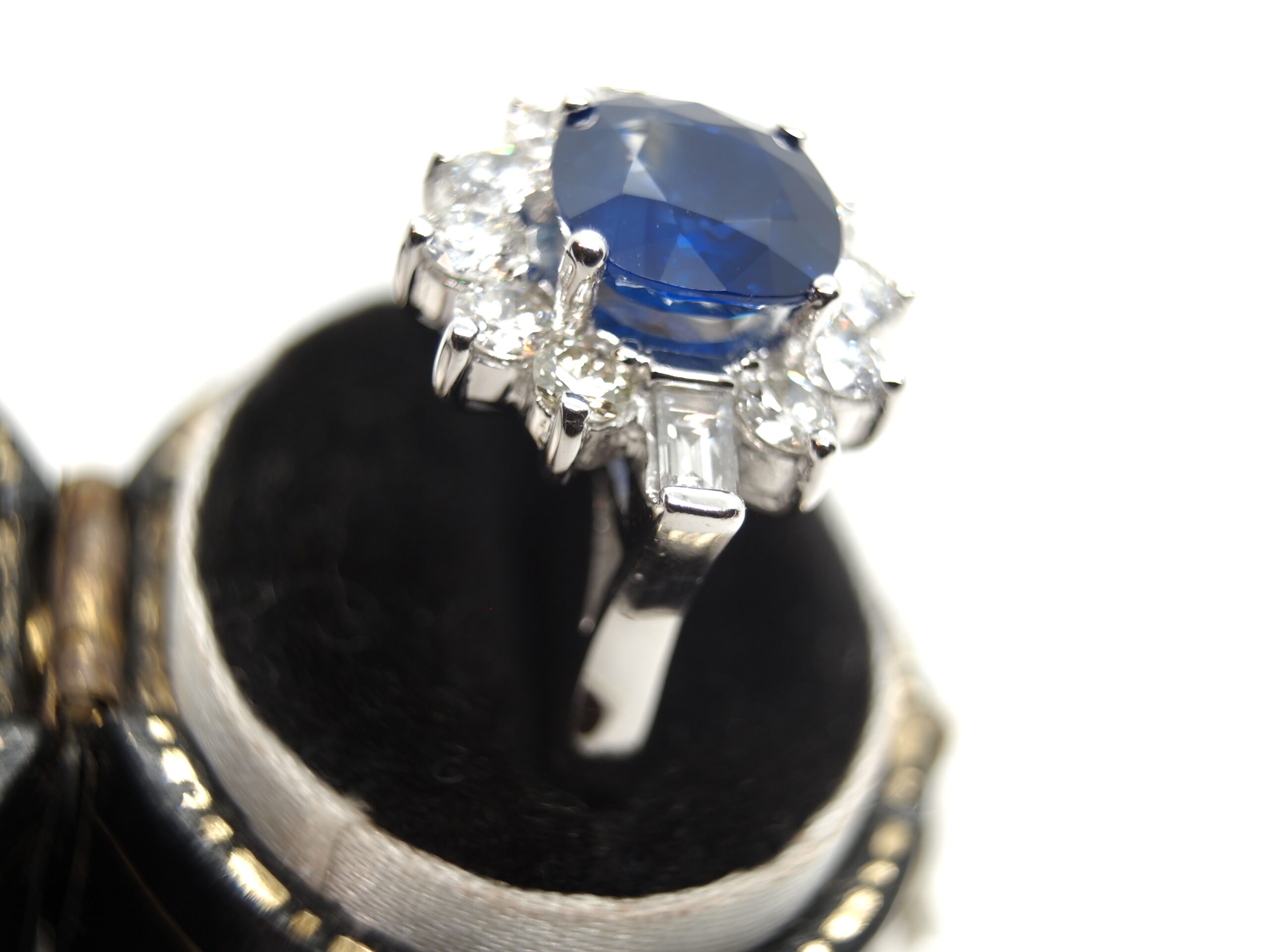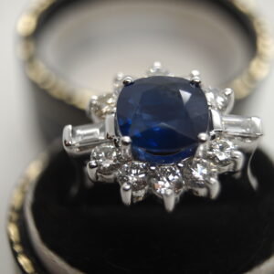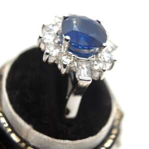The deep blue sapphire is beautifully complemented by two baguette-cut diamonds on the shoulders, adding refined detail and enhancing the ring’s sophisticated silhouette. Crafted in polished 18ct white gold, this timeless design is perfect as an engagement ring, special occasion piece, or luxury statement ring.
