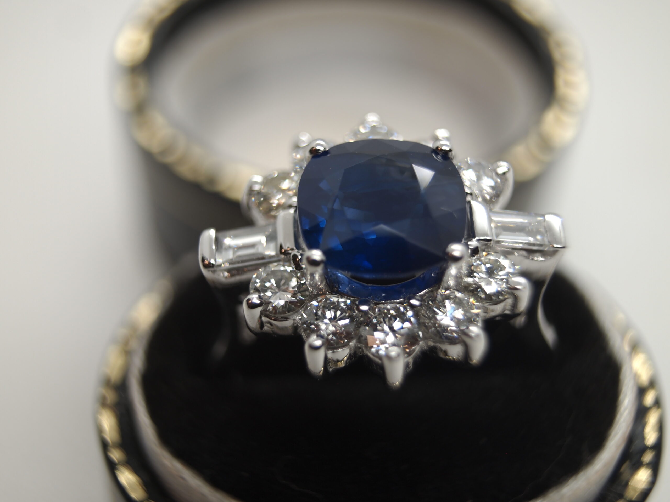 Accent Stones: Diamond halo with baguette diamond shoulders