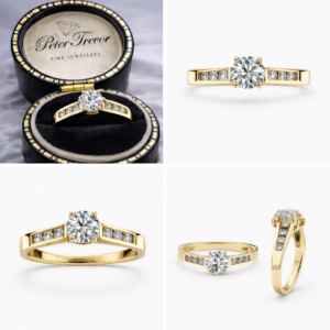 Accent Stones: Diamond halo with baguette diamond shoulders