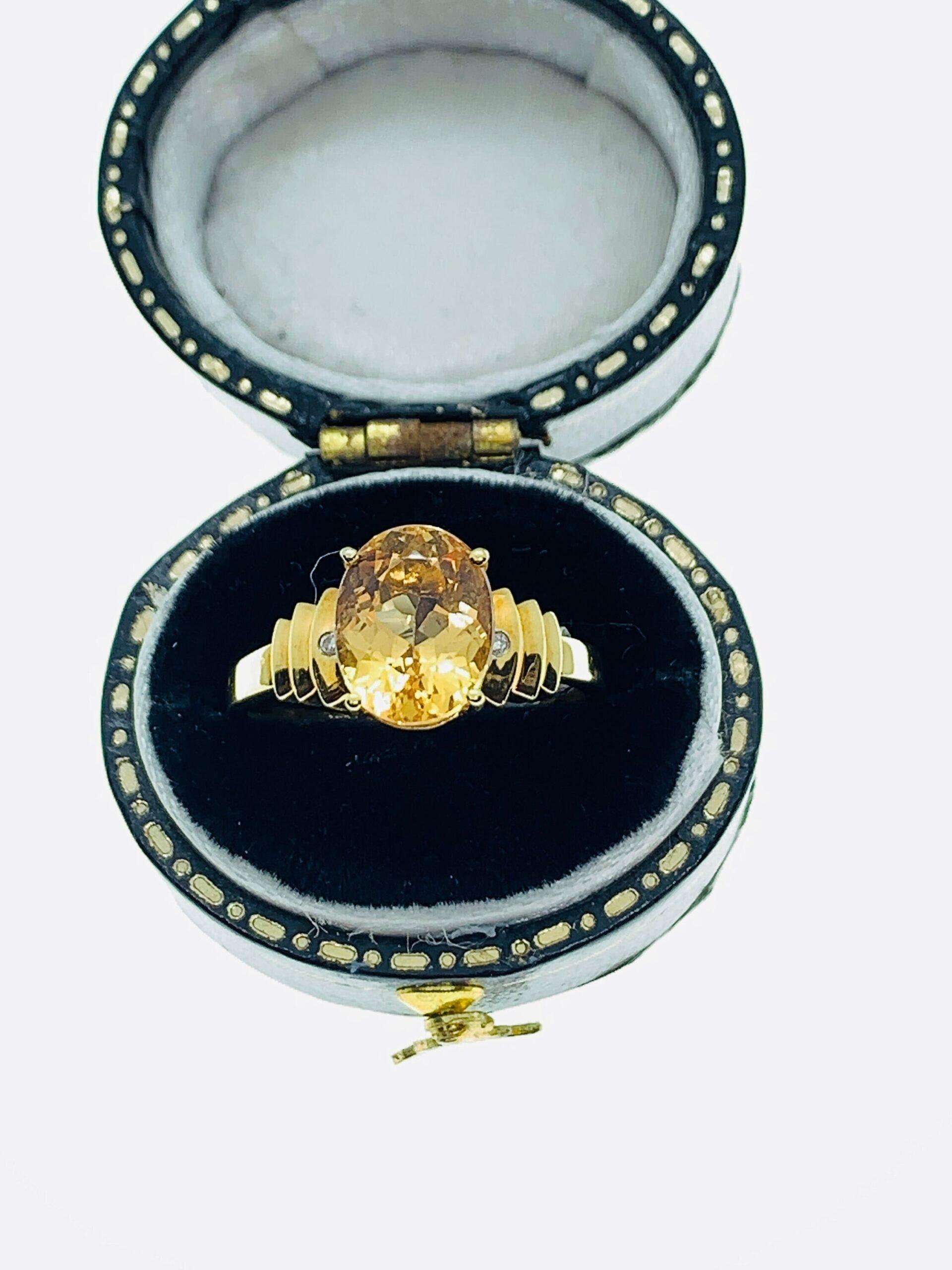 A stunning looking little ring that certainly catches the eye, with an approximately 1.5ct yellow/orange Imperial topaz centre stage. Stepped shoulders the first being inset with a little diamond.